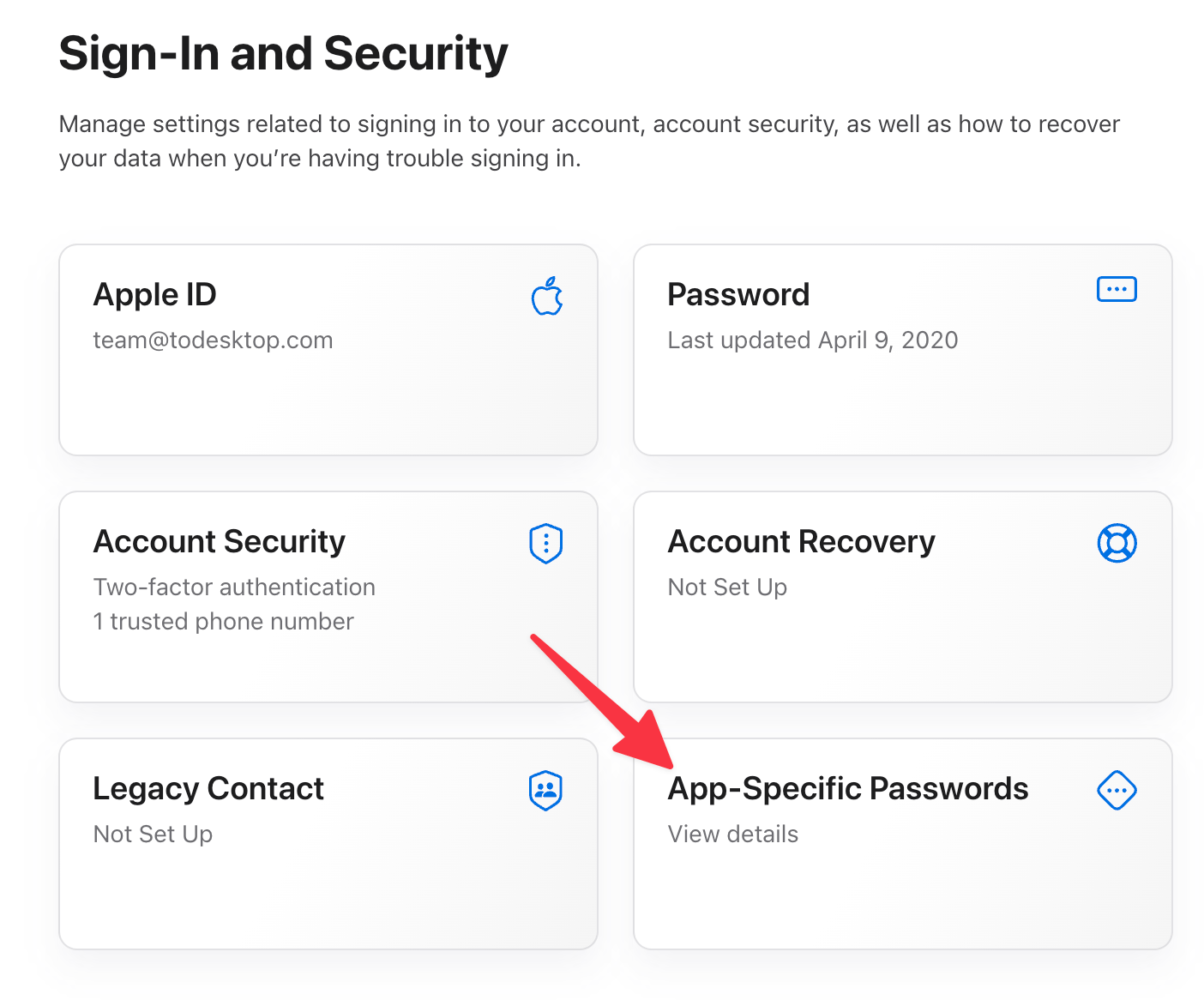 - You may use your existing App-specific password or you can create a new one. If you wish to create a new one (or you don’t have access to your old one) then you can go to Apple's Developer site and choose the “App-Specific Passwords” option.