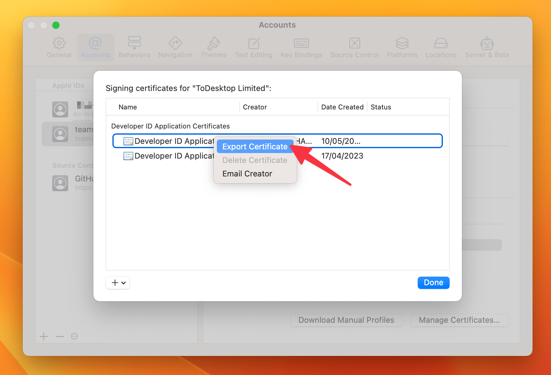 - In the new window, from the left bottom dropdown you can create a new Developer ID certificate